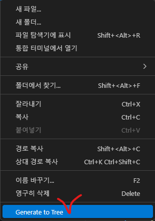 - 위 extension을 설치하면 폴더 우클릭 시 다음과 같은 [Generate to Tree]가 생긴다.