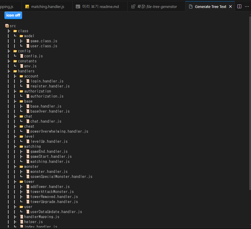 - 이를 클릭하면 다음과 같이 파일 구조가 text 파일로 제공되며, icon off 버튼으로 아이콘 없이 표시할 수도 있다.
